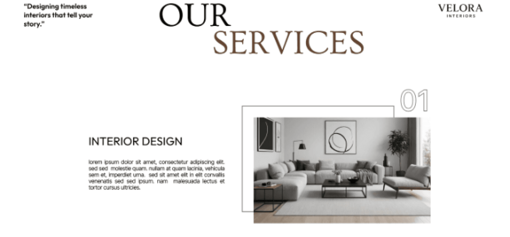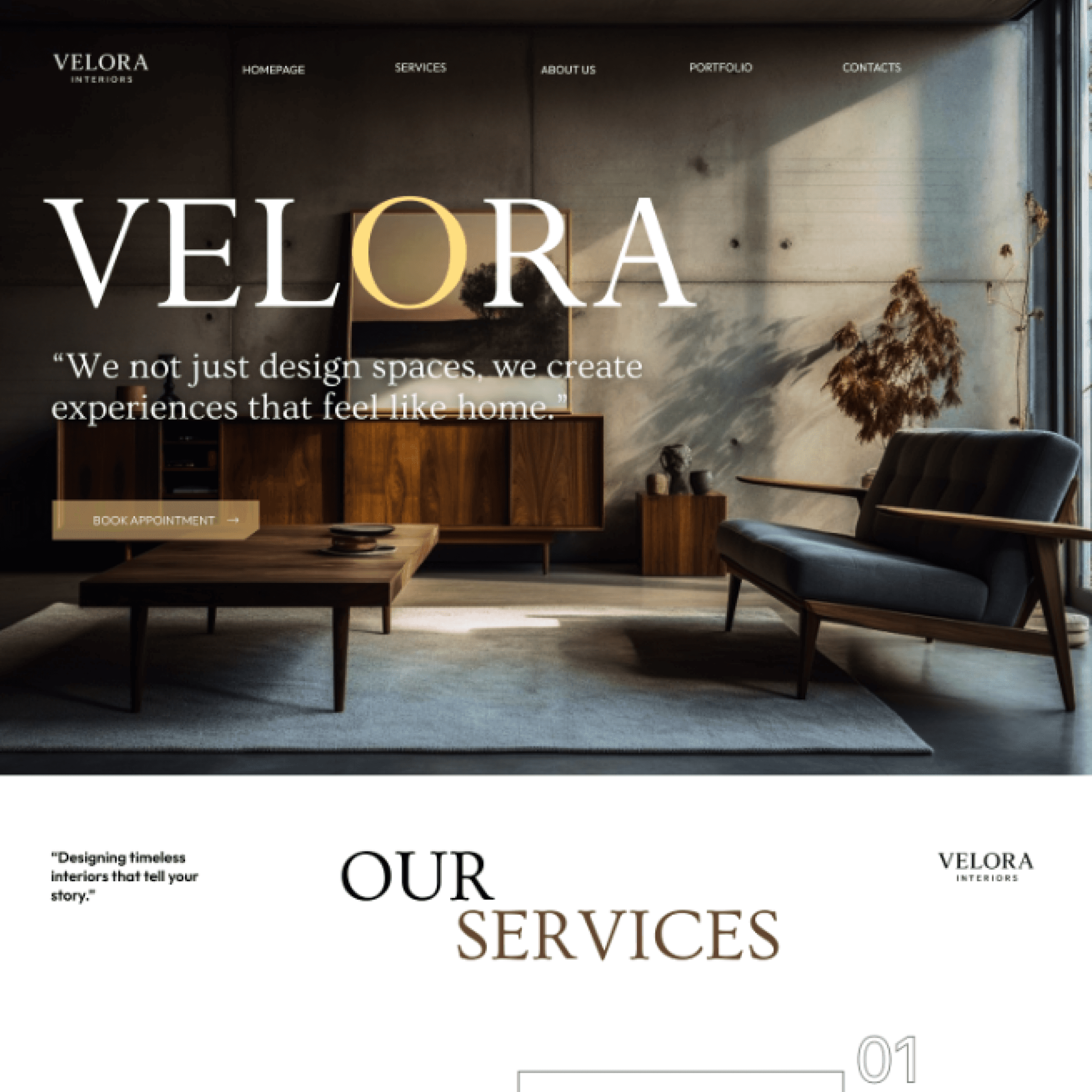 Velora is a interior design agency .In this project the main thing was to make it as clean as possible to build the trust in customers .so all the layout, colors and the typography was chosen to give it a premium and minimal look .In this project ever thing was from very beginning like name ,logo ,design ,color theme etc.