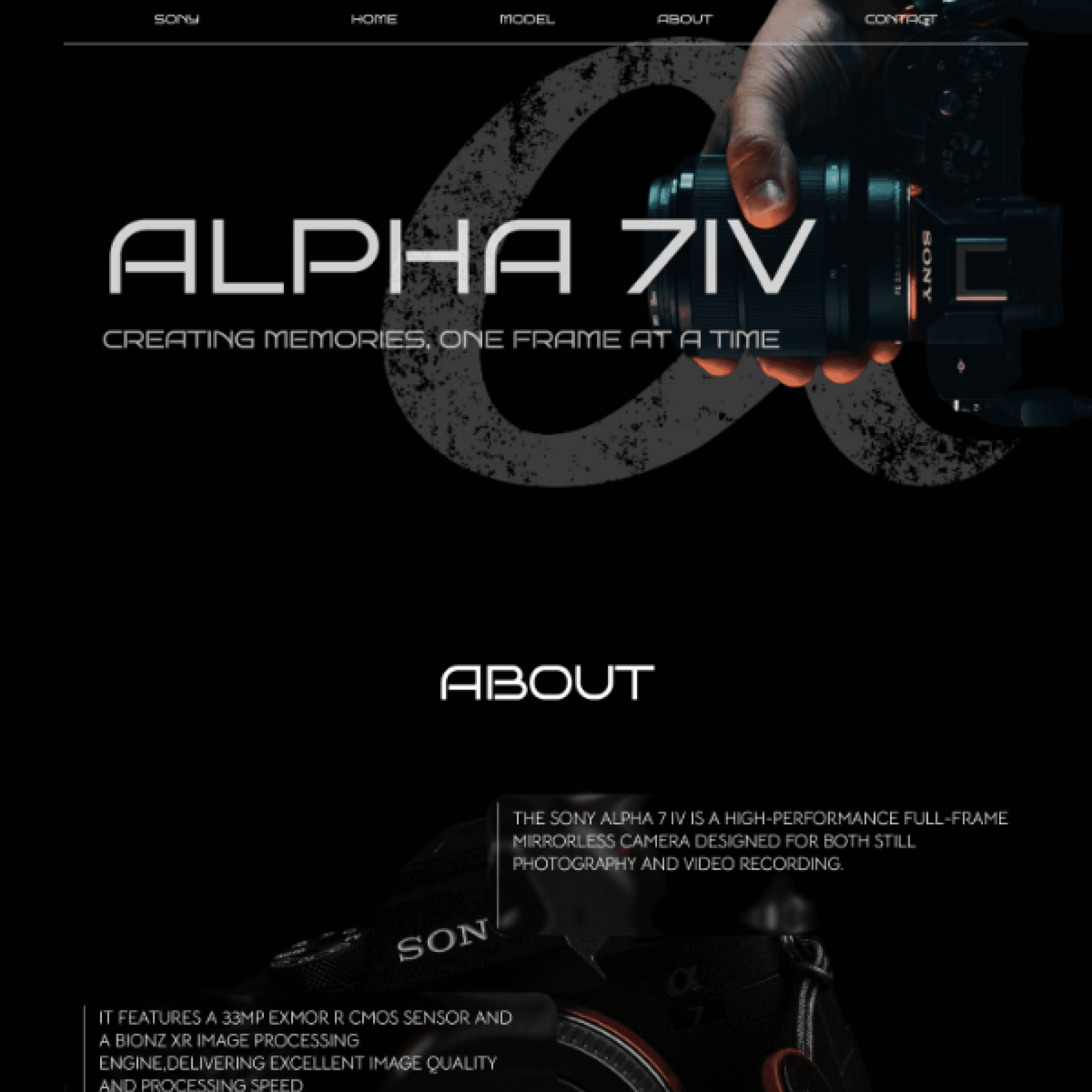 CThis project is a simple, user-friendly showcase for the Sony Alpha 7IV. The design uses clean visuals and clear storytelling to guide people through what the camera is all about—its strengths, features, and the kind of shots it can create. The layout stays easy to follow and visually appealing, making the information feel approachable while still keeping the experience engaging and enjoyable